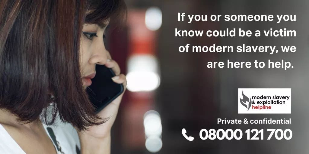 If you believe someone is a victim of modern slavery or exploitation, call police on 999 (101 if there is no immediate danger), or the Modern Slavery Helpline (UK Modern Slavery Helpline and Resource Centre) on 08000 121 700.
